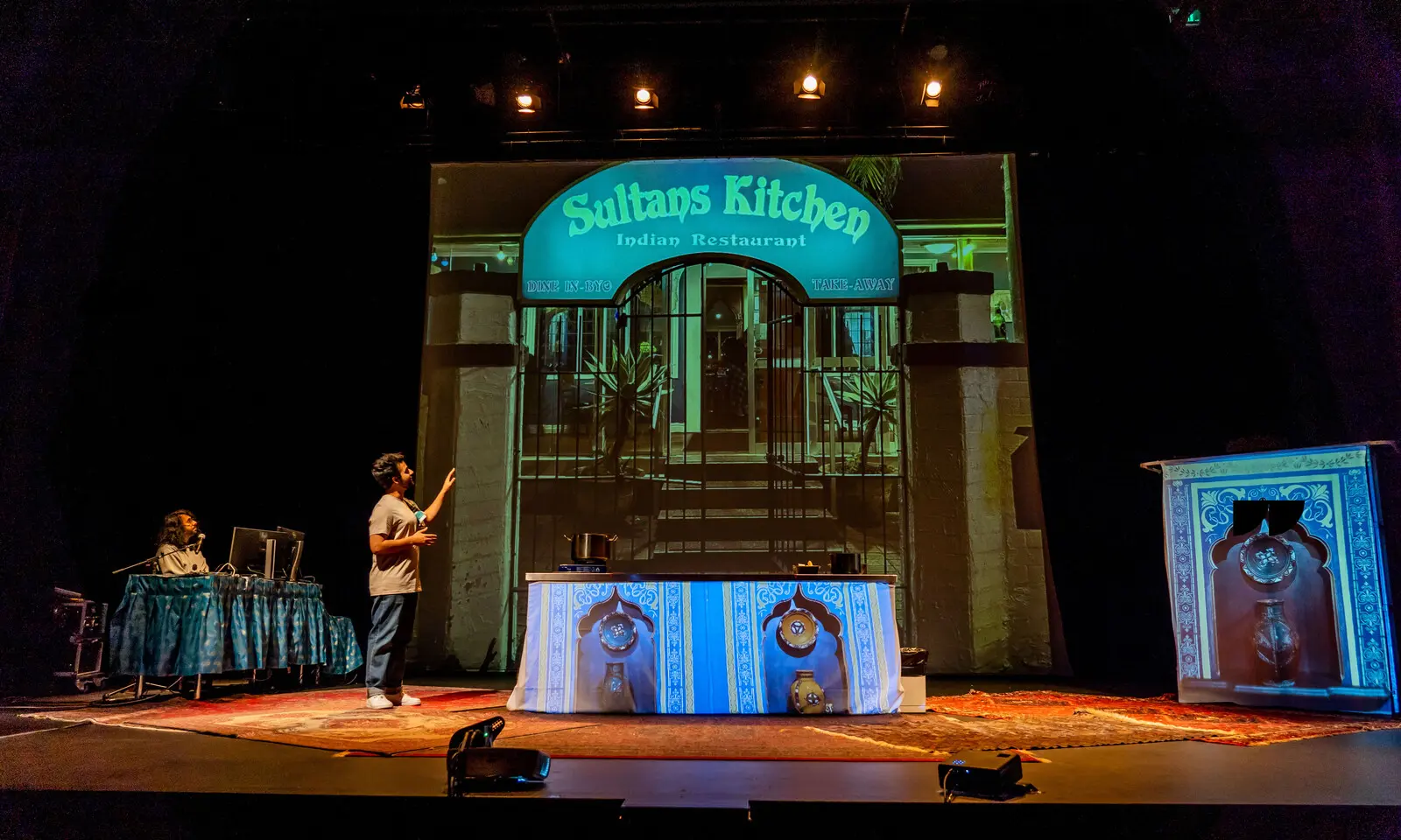 A Place in the Sultan’s Kitchen (or How to Make The Perfect One-Pot Curry), as the title suggests, sits comfortably in this form. Writer-performer Joshua Hinto makes a chicken curry in front of us, all the while telling us the stories of his multiple origins – among them: Persian, Sri Lankan, English – delivered with the most Sydney of Sydney accents. As he makes this chicken curry and tells the story, he’s joined by his brother Dan, who chimes in only on occasion to gently re-direct or chide Hinton.